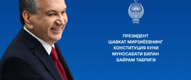 Сиз, азизларни, кўпмиллатли бутун халқимизни 8 декабрь – Ўзбекистон Республикаси Конституцияси куни билан чин қалбимдан самимий муборакбод этиб, барчангизга ўзимнинг чуқур ҳурматим ва эзгу тилакларимни изҳор этаман.